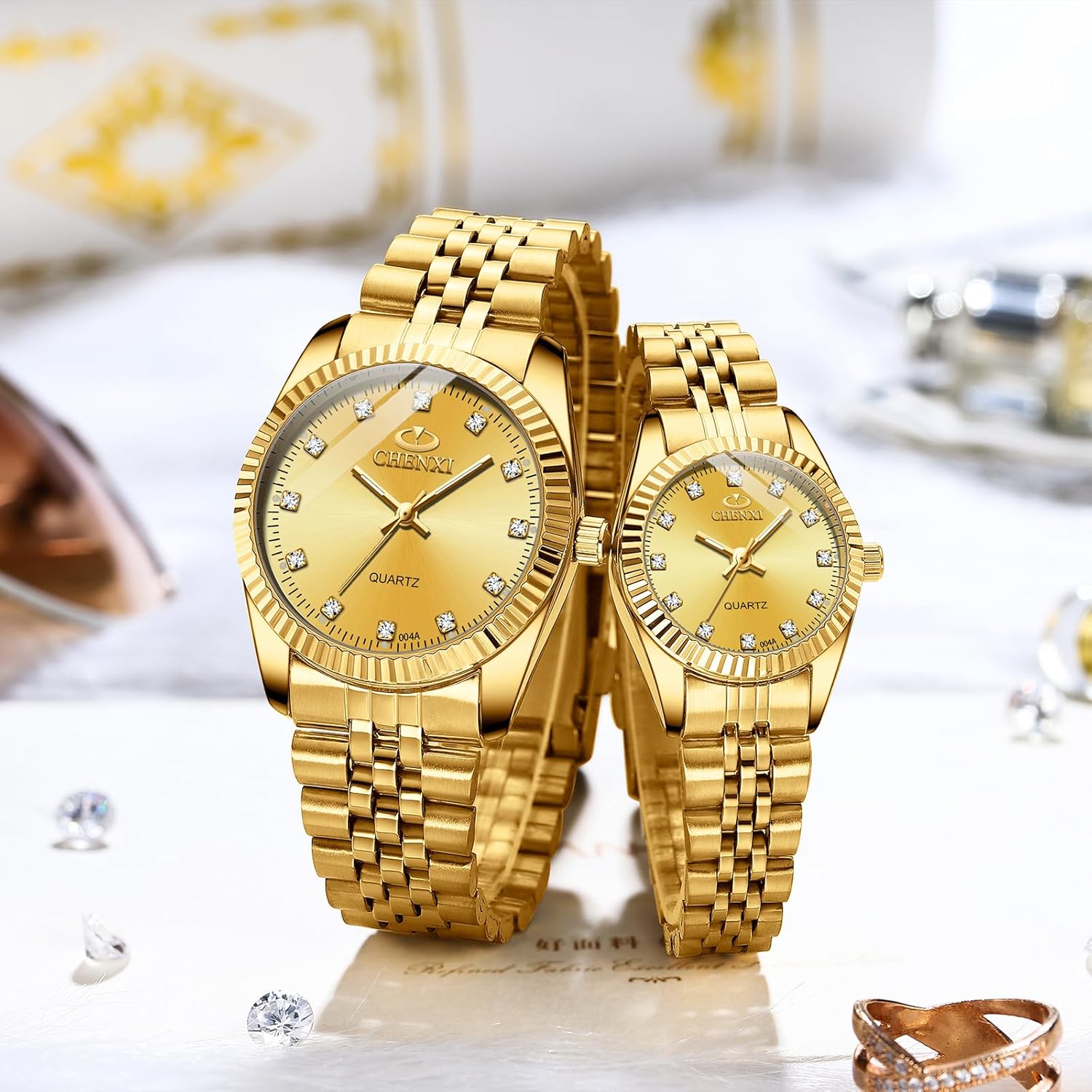 Built with precision and durability, both watches feature a clear dial, scratch-resistant glass, and a waterproof design—perfect for everyday wear and special occasions alike. The comfortable stainless-steel strap ensures a secure fit, while the sleek golden tone symbolizes luxury and unity.